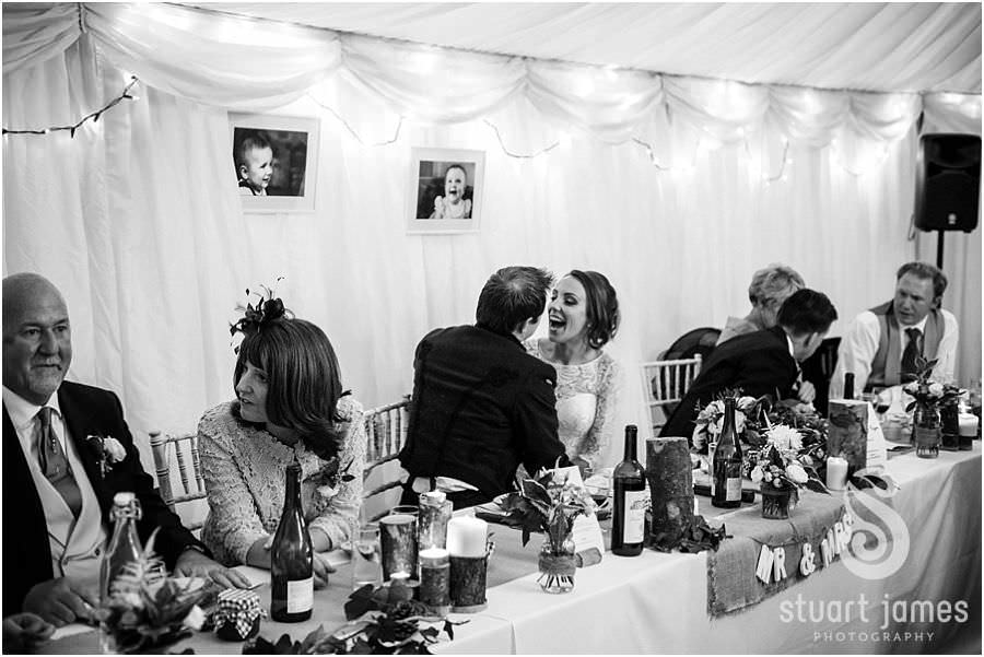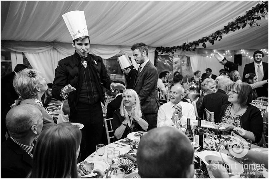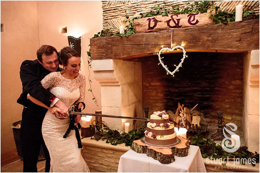 The wedding reception and wedding breakfast set in the marquee in the courtyard of the Oxleaze Barn had a wonderful atmosphere, with the theatre added to with the personal carving of the Beef Wellingtons by individually assigned Rifles Officers at each of the tables – with only a couple needing ‘encouragement’ from the guests to do a better job…
